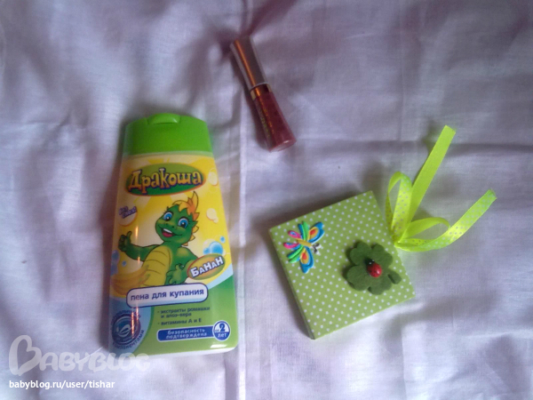Немного косметики для нас с малышкой. Мариша угадала с цветом помады-блеска,едва заметна на губах-в тон к моей смуглой коже. Пенка для купания с таким вкуснючим ароматом банана!!!!!!!! И блокнотик ручной работы-это для меня 100% а то я забываю все постоянно)))))))