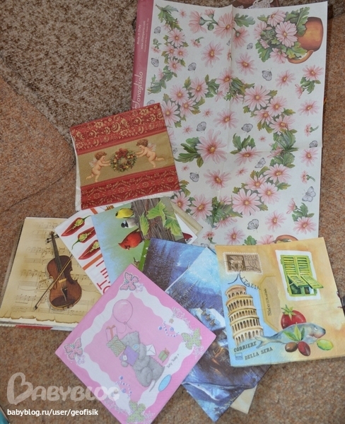Для моих рукодельностей тоже много всего обалденного!!!!!!!!!!! Я даже не видела подобных журналов в наших окрестностях!!!! Сегодня всё рукоделие забросила, сижу слюной исхожу глядя на картинки))))) Уже и связать что-то хочется))))) А салфетки... мммм... У меня их ОЧЕНЬ много, но НИ ОДНОЙ из тех, что прислала Леночка!!!!!! Ох, мой хомяк и придушил жабенцию))))) Шкатулочка для декупажа... не устаю повторять: КЛАССНАЯ!!!!!! Рядом массажёр лежит, думаю, что он пока обойдётся без декупажа)))) Софья посмотрела на него и сказала: Маме скалку для мяса прислали))))) Соеденив при этом кухонные принадлежности скалку и молоток для отбивки)))) Ну правильно мамино мясо жир папа этой "скалкой" разомнёт)))))