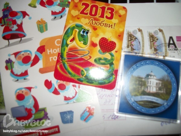 и подарочки! светящиеся в темноте наклеечки с Дедом морозом! и календарик 2013 года! Спасибочки, Региночка!!!!