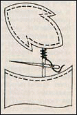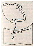 3. Детали узора обшейте по контуру швом «вперёд иголку» или швом «за иголку». Одновременно проложите нитку 2 раза для каждой бриды (перемычка из ниток между деталями узора). Для этого деталь узора, например листочек, обшейте до бриды, проложите нитку на её длину и сделайте маленький стежок вдоль края ткани у противоположного конца бриды