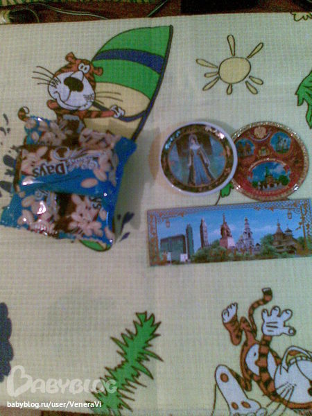 Подарочками были полотеньчико с тигрятами и конфеты, которые дочка сразу утащила и стала есть. Пару штук еще в садик унесла (одну я успела урвать, а наш папа не успел)))
