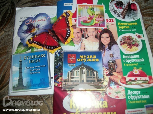 Два замечательных магнитика Куликово поле и Музей оружия. Также Региночка отправила мне магнитик Змейку, кулинарный журнальчик а мою коллекцию и открыточку к моему дню рождения!!!