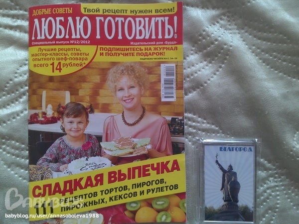 Наконец то дочка отпустила меня в интернет чтобы я смогла отправить отчет о получении магнитика. Магнит из Белгорода прилетел ко мне уже неделю назад а вместе с ним и журнал про вкусную выпечку))))) - спасибо огромное))))))) Кстати данный журнальчик мне очень пригодится ведь совсем скоро нужно будет радовать малышку всякими тортиками и печенками)))))))))) Ещё раз спасибо и хороших вам новогодних праздников)))))))