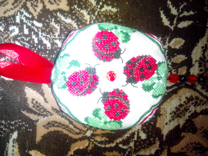 рукоделочка-игольница, но так жалко ее использовать по назначению, поэтому просто как подвесочку повесила))