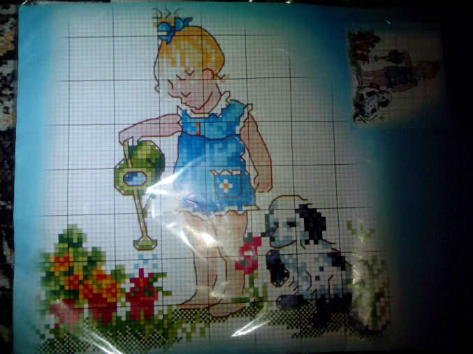 набор для вышивания крестиком. вот такая девочка в голубом платюшке, похожая на мою кнопку))