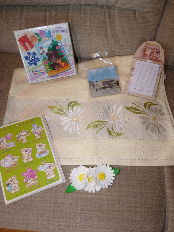 Но и на этом еще на все!)) Заколочка с ромашками тоже дело золотых ручек Светочки!) А еще полотеньчико с ромашками - символом дня семьи, любви и верности, магнитик с Полазна (такого у меня точно не было))) и магнитик с блокнотиком, действительно нужная вещь)) а еще паззлы для моего зайки и открыточка с письмом: