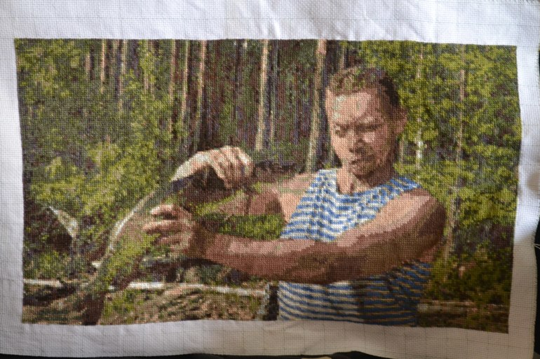 Тут два минуса, 1-й -зеленый цвет на щуке, его ТОЧНО надо заменить, и 2-й - переход на теле мужа от темного к самому светлому, еще один бы переходной цвет, и получилось бы вообще хорошо. Я когда портрет вышивала, раза четыре один цвет выпарывала и подбирала чисто на глаз, результат не устраивал, слишком резко. А в целом очень хорошо получилось! Вы молодец!!!