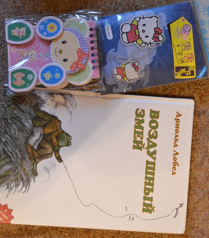 Блоктнотик, Брелочек-вышивка (мама скоро вышьет) и книга!!!! Уже читает сама!!!