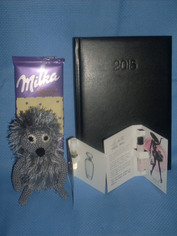Для Илоночки, всё как она мечтала! Ёжик вызвал у взрослого ребёнка щенячий восторг:)!Запах духов, такой как она любит!Новый ежедневник - очень нужная вещь, в её любимом стиле и цвете!Огромное спасибо от Илоны!