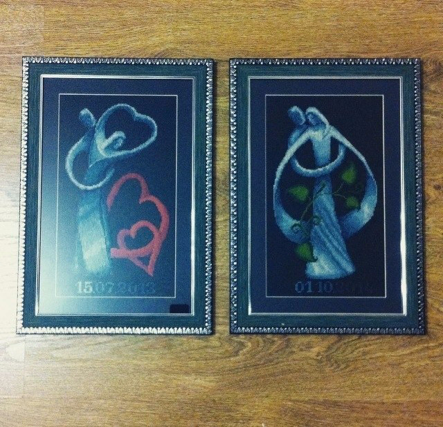 Эти работы означают: любовь и супружество. Внизу наши даты. Третья работа: "рождение" пока на оформлении.