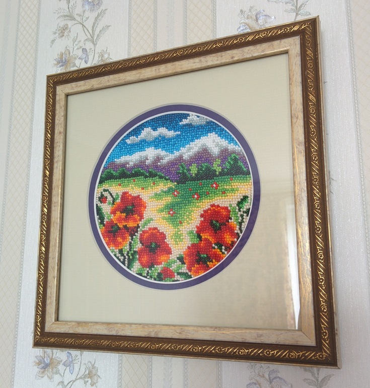 3) С Домиком оформила сразу и Маки, вышитые бисером. Оформление похоже, т.к. и Домик и Маки висят на одной стене