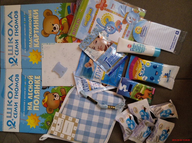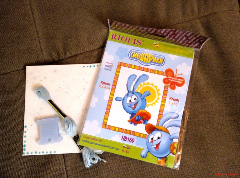 Хомяку достался набор для вышивки Крош (я как раз сына зайкой зову, вышью для него), ботинки, ниточки, заготовка для открытки.