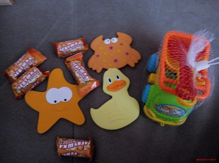 Для сына Феечка прислала конфетки, наклейки в ванну и формочки с машинкой ( будем в песочнице самые деловые)