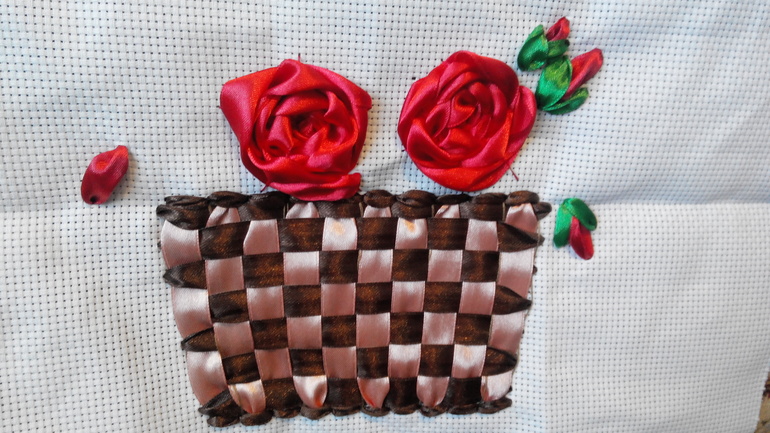 Вышивать лентами и трудно и легко одновременно. К сожалению я не ответственно подошла к выбору лент((( на корзину (да-да это корзина) стоило взять ленточки потоньше, а то корзина пол картины занимает или же надо было пониже ее сделать. Пока вышивала очень болели пальцы, т.к. приходилось с силой протаскивать ленты через канву, а для этого нужно иметь недюжую силу. И главная трудность - фантазия. Очень сложно мне было разложить все по местам.
