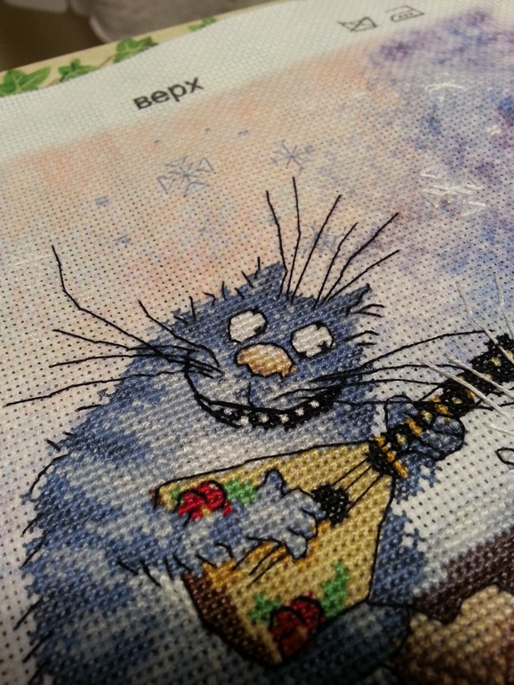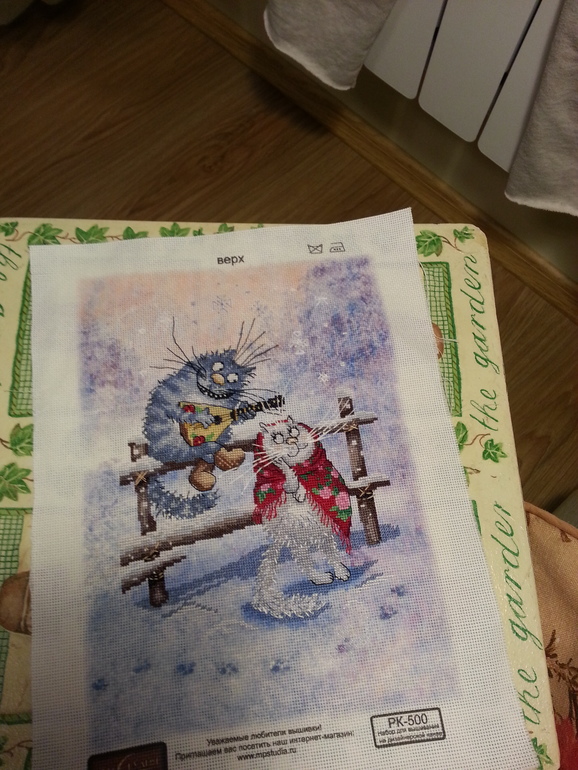 Канва Аида 18. Нитки Гамма( ужасное качество! ) Во время работы скручивались, завязывались в узелки, и даже несколько раз рвались. Нарезаны коротко(для меня это минус) Из плюсов - отличная хорошо читаемая схема и забавная картинка.