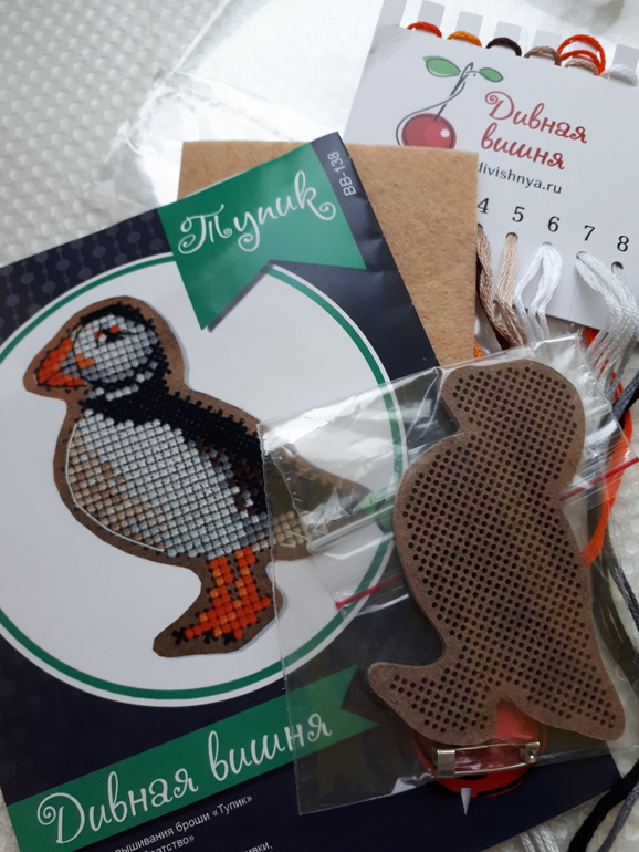 В набор входит : деревянная основа, схема(две штуки) , нитки , игла (погнулась, но не сломалась), задник (кусочек фетра, закрыть изнанку), булавка