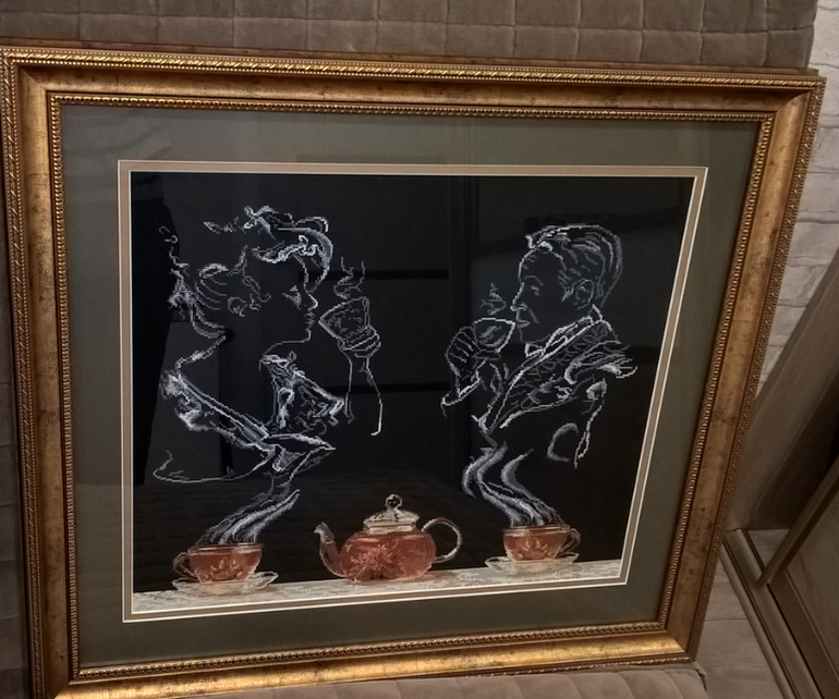 2. Чайная фантазия -бесплатная схема с интернета, подарена родителям. Черная канва 16 каунт.