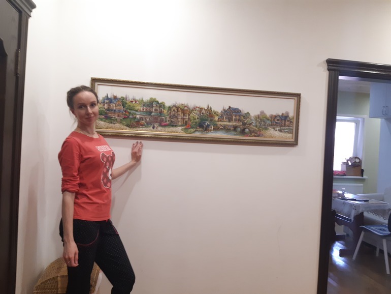 До сих пор глядя на неё мне не верится, что я её вышила))) вышивая её хочешь-не хочешь, но начала верить в вышивальные приметы, за 1,5 года пока я её вышивала столько всего поменялось в жизни и вид из окна теперь очень напоминает эту уютную деревеньку на картине)