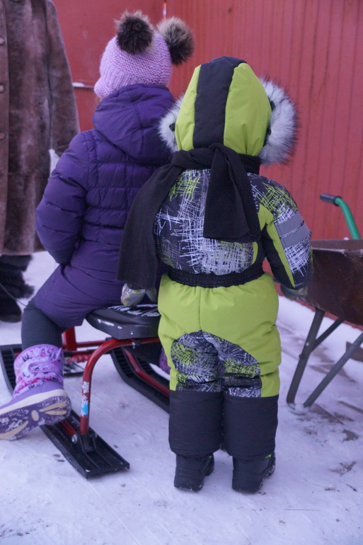Опять впопыхах ткань заказала и на момент пошива у меня оказалось три отреза по 0,5 (чем только руководствовалась?). Собирала, ругала себя, но шила. Утеплителя много затолкала - 200+150 альполюкса + флис на подкладе (на рукава и в штанины всё же подкладочную лучше ставить). Выкройку взяла из оттобре 4 2014. Горловину заузила, пройму немного опустила, рукав расширила, воротник по готовой горловине скроила. Выкройку взяла на 98 (хотя изначально на 104 перерисовала), получилось прям как раз, но нужно было всё же больше делать. Сделала трикотажные манжеты на юбочках - получилось очень тесно с крагами, убрала, вшила манжет на резинке. В штанинах юбочки с обычной резинкой. Планка собрана из остатков. Кап выкроен по капюшону со старой куртки - удобный. Всё супер просто. Комбез получился очень тёплым, одеваем на водолазку и колгтки. Даже в -24 было тепло. Фоткались, кстати, в -22. Опушка мужу не нравится, но я её уже на кнопки посадила. Спасибо Кате за онлайн пошив. Почитала, посмотрела, и заставила себя сделать это. Фоткаться успеваем только у бабушки, пока занят своими важными делами, даже собаку снегом успел покормить.