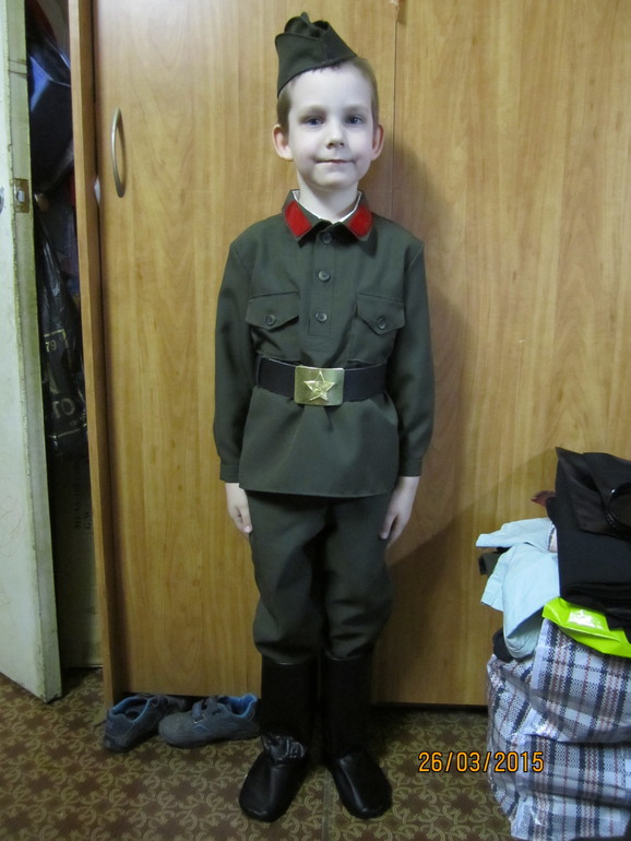 я долго искала выкройки, но так и не нашла. пришлось самой делать. брола старые брючки и по ним снимала мерки, а выкройку гимнастерки снимала с простой рубашки. пилотка из того же материала, что и костюм. точно не помню как ткань называется, но похоже на х.б. сапожки тоже шила сама из кожзам. по размеру резиновых сапожек.