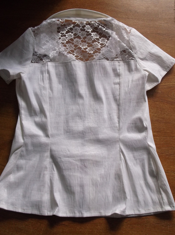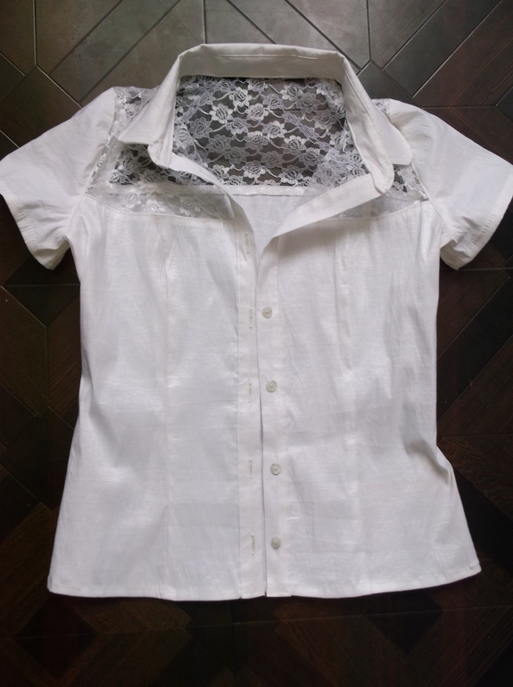 Блузка и юбка. Блузка из тафты и гипюра, тафту купила уцененную, последний кривой кусок (реально срезы были скошены сантиметров на 15), гипюра дома был маленький кусочек, без него не хватило бы. Застежку сделала на планках, они не настрочные, а вообще отдельные. Воротник отложной на стойке.