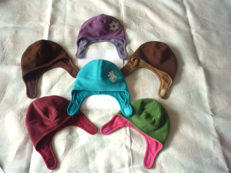 Подробности про ткань -зелено-розовая- полартек 100+ флис , бордовая также, бирюзовая - полартек 200+кулирка, коричневые и фиолетово-серая- флис. Размер на 2-3-4 года- в зависимости от размера головы. Выкройкой делилась девушка с Осинки, ника не помню ( простит меня,надеюсь :) )