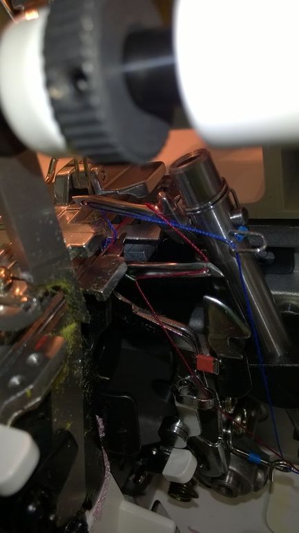 Лена, здесь плохо видно, но все же. Попробуйте маховиком поднять петлитель красной нити (читай красной маркировки(кружок)),именно до такого подложения, как на последнем фото, заправь нить в петлитель, предварительно заправив все узлы по инструкции или на открытой крышке есть подробная инструкция. затем заправив петлитель с красной маркировкой, аккуратно перебрось нить через петлитель, в которую идет нить с синей маркировкой. и под лапку за нити(от тебя за нити) от иголок. еще сегодня пробовала заправить нити петлителей и не перебрасывать через петлитель с "синей" нитью, а аккуратно завести за иголки и проварачивая вручную маховик, петлитель второй ее набросит на себя. это при правильной заправке. П.с. пробуй, если не получится, пиши где именно сложность будет, я заправлю цветными нитками как у тебя ( и по маркировкам), там будем сравнивать. но я больше, чем уверена, что проблема в подачи нитки после петлителей.