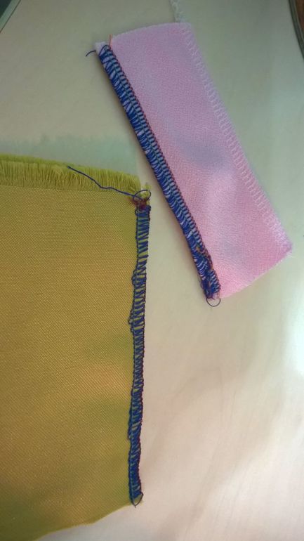 у меня Бернина, но система та же. На готовом образце у вас 4 ниточный шов. Когда убираете иглу для 3 ниточного, верхний петлитель ( синий) нужно регулировать. у вас нужно его ослабить., а то нижний петлитель и игольная нить очень петляют и строчка съехала с кромки наверх.а для подшивания нужна двойная строчка ( она делается плоскошовной ( распошивальной) машиной или на обычной швейной машинке двойной иглой). На оверлоке можо подшить швом флэтлок. Это нужно отключать нож и менять настройки натяжения по инструкции или МК в инете. Сама таким не шью. Пользовалась двойной иглой, пока распошивалку не купила.