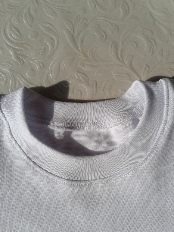 Вы сначала пришиваете горловину к футболке, а потом уже отворачиваете и делаете строчку по лицу, как бы пришивая припуск?