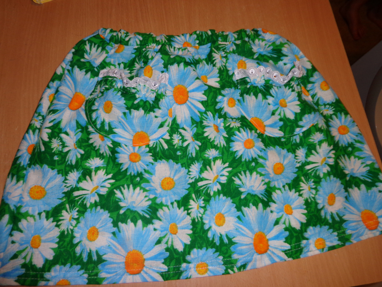 Юбочка из бязи, получился комплект "Ромашковая полянка", на футболке бантик ромашковый и термотрансфер нашелся с ромашками.