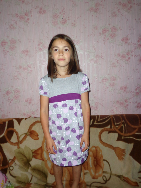 Злата вернулась с лагеря и ей сшила тунику с фиолетовыми яблочками, получилось платье.