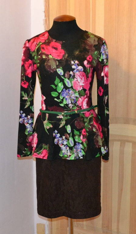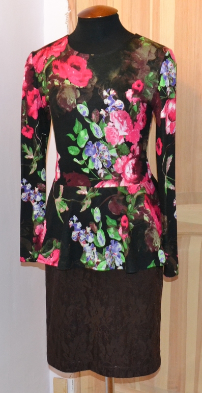 А это ещё одна кофточка из трикотажа. Баска, сзади удлинненая. Простая, но достаточно эффектная. Ткань , классная по качеству, ни одной катышки, за все время носки. Розы на темно, практически черно-коричневом фоне. Сшила быстро, на одном дыхании, а вот партнера, подобрать не могла, очень сложный фон, цветные юбки смотрелись плохо.