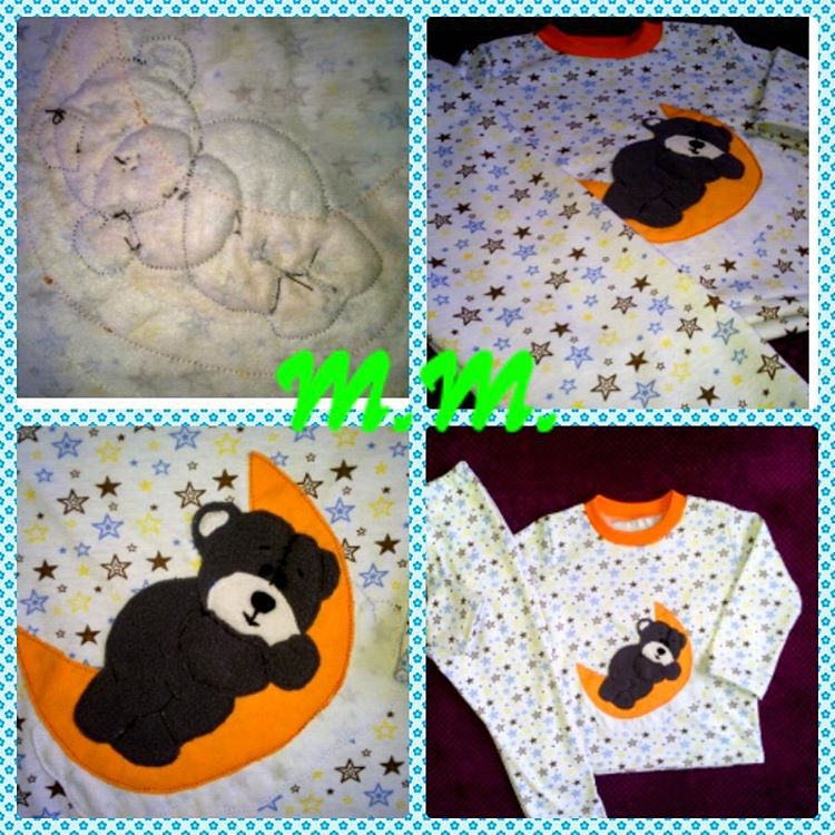 Пижамка для дочки подруги. Выкройки на рост 86. Штанишки так и вышли,а вот кофточку на сантиметр увеличивала спинку,полочку и рукав и все равно на 80 получилась. Первый раз делала многослойную аппликацию по мк в сообществе, боялась,что не получиться,но оказалось все не так страшно) ткань кулирка,отделка рибана, аппликация кулир и флис