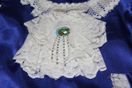 Ткань: синий искусственный шелк, синий бархат, розовый креп-атлас из допотопных запасов, кружево из бабушкиных запасов, пришивная бусина, типа пластмассовые стразы на нитке (старые)