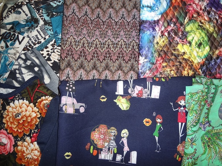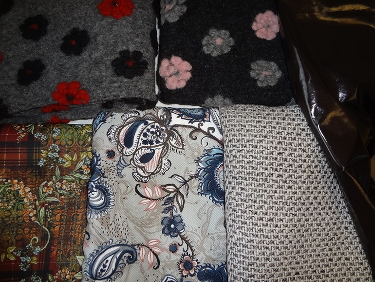 И Solvita итальянский текстиль, тут 2 пальтовочки с цветочками (думала девчонкам на пальто, но темноваты, теперь лежат, ждут озарения), монклеровская плащевка цвета горький шоколад, посередине пике Этро на пальто, и Шанелька на юбочку, а ну и самая красота в клеточку - это принтованый неопрен, за который браться боюсь))