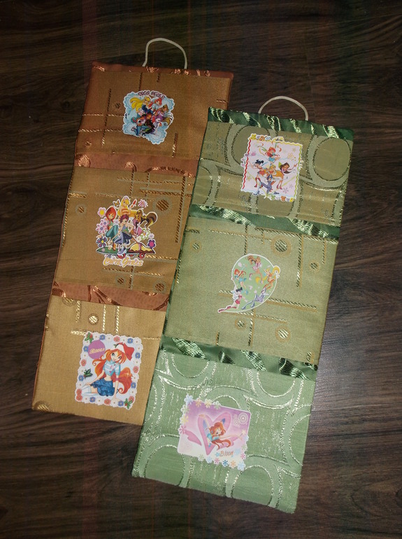 Ну и чтоб 2 раза не вставать, как говорится, покажу тут еще кармашки в садик Мане и Ане, шила их еще осенью, давно уже благополучно висят в кабинках. Внутри картон. Из портьерной ткани, ага))) Надо ж куда-то пристраивать эти куски, что мне сестра регулярно отдает.