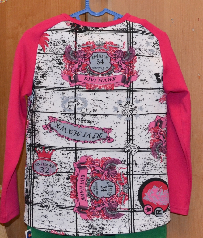 Пошились из интерлока две вещицы Катюшке и Настене. Рисунок на ткани очень сильно косил, на футболке это виднее. Попробовала выкройку из Оттобре 6/2015. р.134 и р.104, только линию низа изменила и длину рукава на футболке.