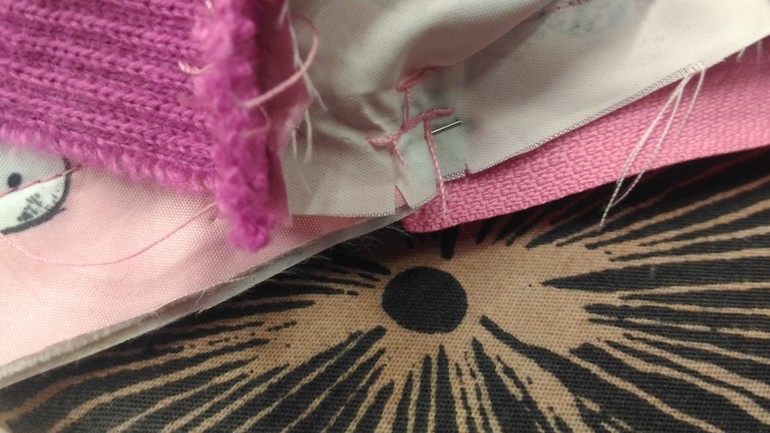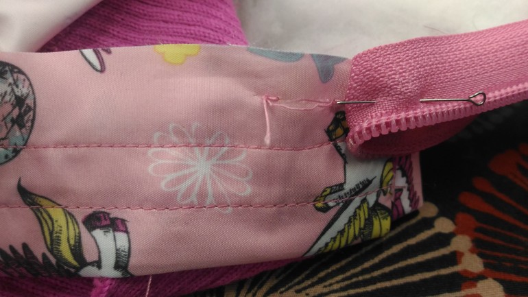 Самое кошмарное ответственное - вшивание верхнего хвостика. На одной стороне делаю как ляжет, отдельно фиксируя остаток молнии в нужном положении.