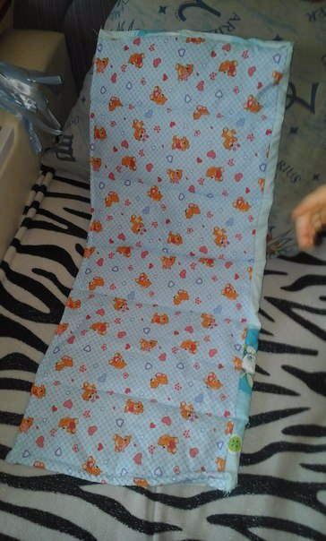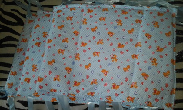 Одна из первых моих работ была - защита - бампер на три бортика в кроватку, постельное и матрасик в коляску. Фото не качественные и я не знаю как правильно фоткать поэтому прошу не судить строго)