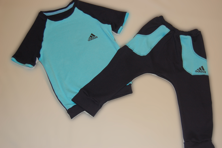 Далее пошился комплект из интерлока синий и бирюзовый,термотрансфер адидас. Футболка - выкройка на основе толстовки с руковом реглан из оттобре 1/2014,бриджи -все та же выкройка на основе брюк из того же отто 1/2014.
