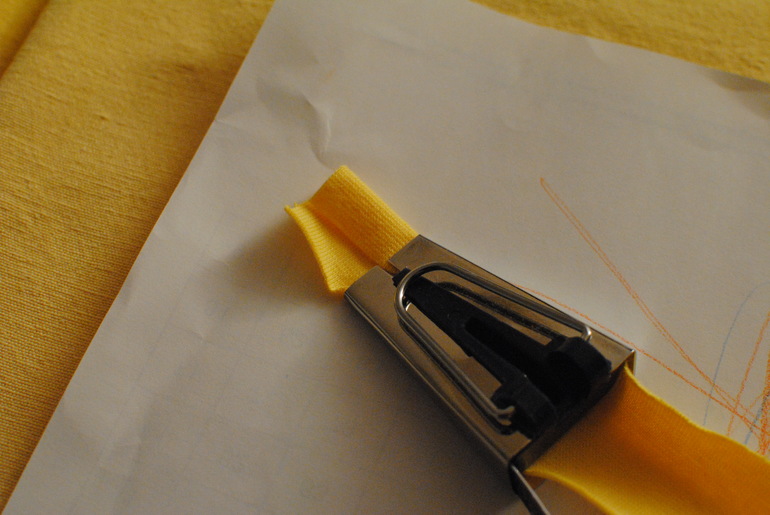 присособление для изготовления косой бейки, 25 мм на выходе. Чтоб получить бейку в три сложения блокируется картонкой одна часть. Пришивала я двойной иглой