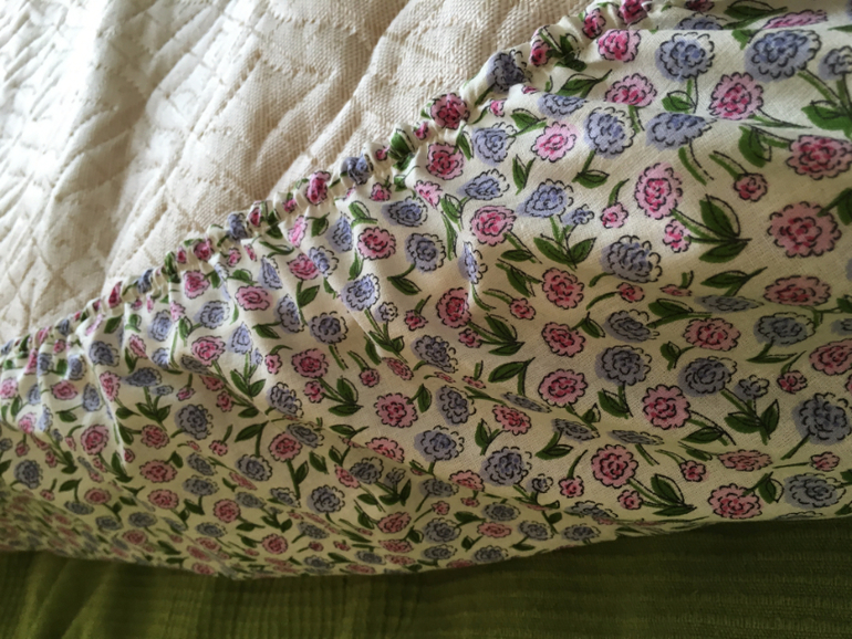 Сама тоже хочу на дачу нашить, тоже думаю над кроем, в икеевских простынях ведь углы с вытачками, те не просто резинка по приметру вставлена, у вас получается много лишней ткани из за того что не вырезали углы.