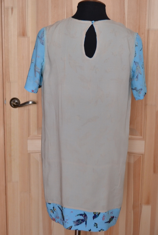 Платье с птичками тоже вискоза, переплетение пореже похоже на то, которое бывает на палантинах. Ткань подороже 800/м, но первой проигрывает. Имеет свойство расползаться. Эта ткань тоже подходит под первую выкройку.