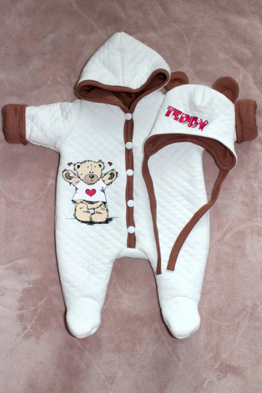 Комбез из капитоне . Выкройка слипа 1-2012 м3. Размер брала 56, по ширине прибавляла по 1 см под утеплитель (изософт 60). На подкладе интерлок "карамельное мокко", из него же бейка. На рукавах сделала ручки закрытыми с возможностью отвернуть. Шапочка по своей выкройке, так же с утеплителем и интерлоком на подкладе.