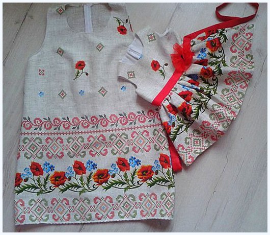 Я видела платье на девочке 3-х лет из такой ткани. Смотрится ну очень стильно! Я сначала и не разглядела, что это рисунок, а не вышивка. Мама привела ее на 1 сентября в садик. По сравнению со всеми девочками в обычных вышиванках она выглядела круто! При чем модель платья была очень простая, как на вашем фото слева.