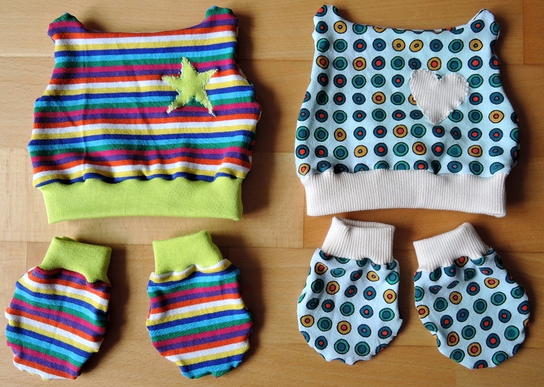 И шапочки-царапки по выкройкам с блога Ольги Поторочиной. Материал - трикотаж. Манжеты - рибана. После пошива еще не стирала, видно маркер на звездочке;)
