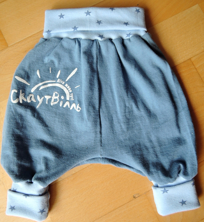 Эти мини-штанишки на 56 размер я шила по выкройке. Те, что справа, я показывала раньше уже, к ним дошились еще двое. Материал трикотаж, синие вообще из моей старой футболки, в которой я работала в летнем лагере Скаутвилль))) Манжеты и пояса - рибана.