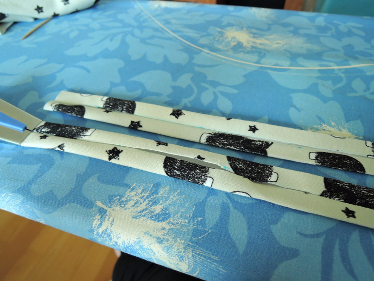 Есть вот такая классная штука, не знаю, как это зовут по-русски, а на немецком Schrägbandformer. Купила недавно, чтобы делать себе косые бейки для обшива края детской одежды. Сегодня был первый опыт с ним/ней. Очень довольна.