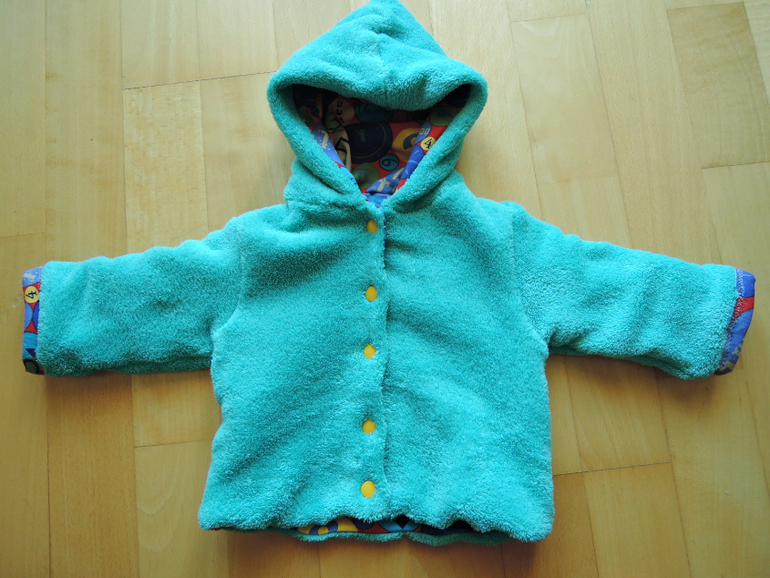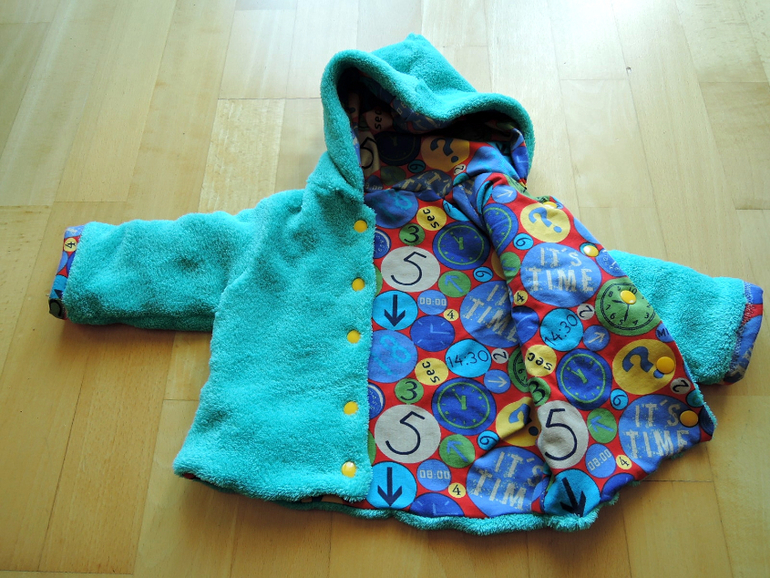 По этой же выкройки кофточка потеплее. Она тоже вроде как двухсторонняя, но носить скорее всего будем только трикотажем внутрь. Как бирюзовый материал называется не знаю, купила плед и с него кроила. Ткань с часами - трикотаж, кнопки пластиковые. Рукава обработала по другому.