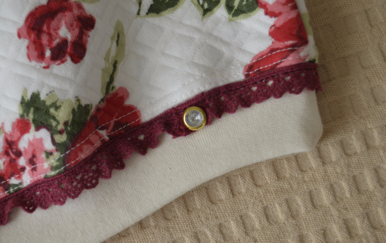 В дополнение к декору рукава, по поясу пришила такое же куржево и украсила стык хольнитеном со стразинкой.